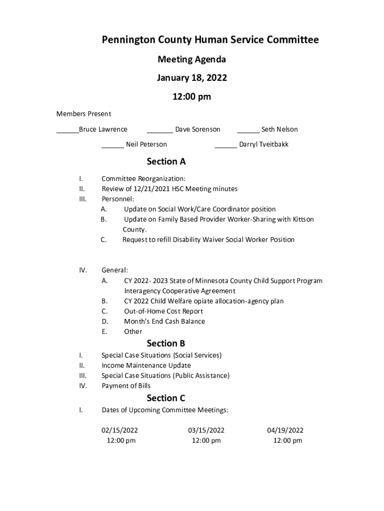 Pennington County Human Service Committee Meeting Agenda January 18, 2022 12:00 pm Members Present ___Bruce Lawrence___ Dave Sorenson___ Neil Peterson___ Seth Nelson___ Darryl TveitbakkSection A I.
