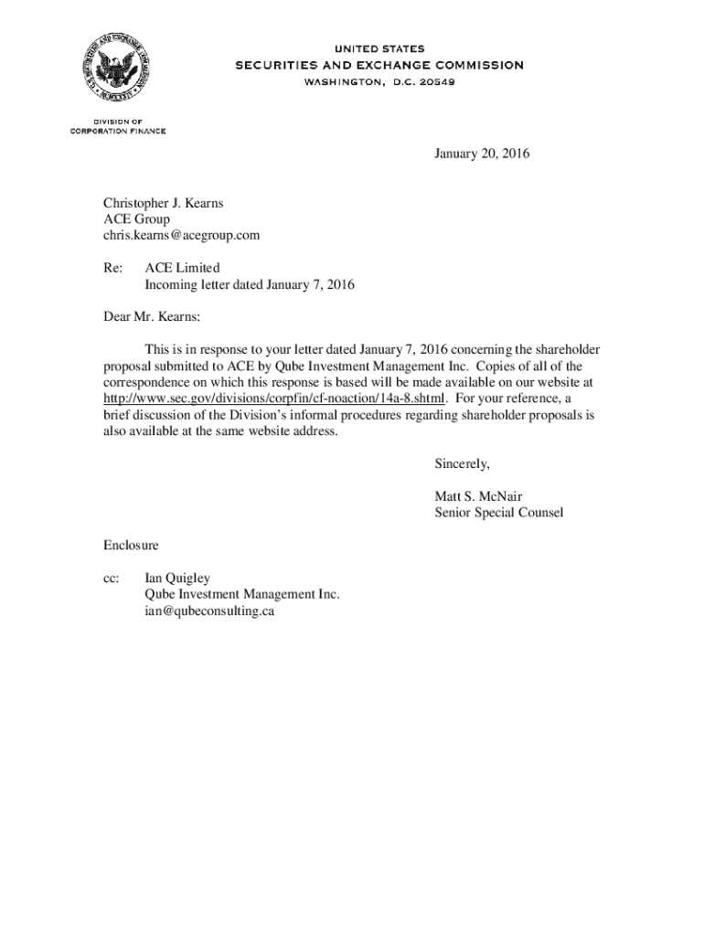 January 20, 2016Christopher J. Kearns ACE Group chris.kearns@acegroup.com Re:ACE Limited Incoming letter dated January 7, 2016Dear Mr. Kearns: This is in response to your letter dated January 7, 2016,