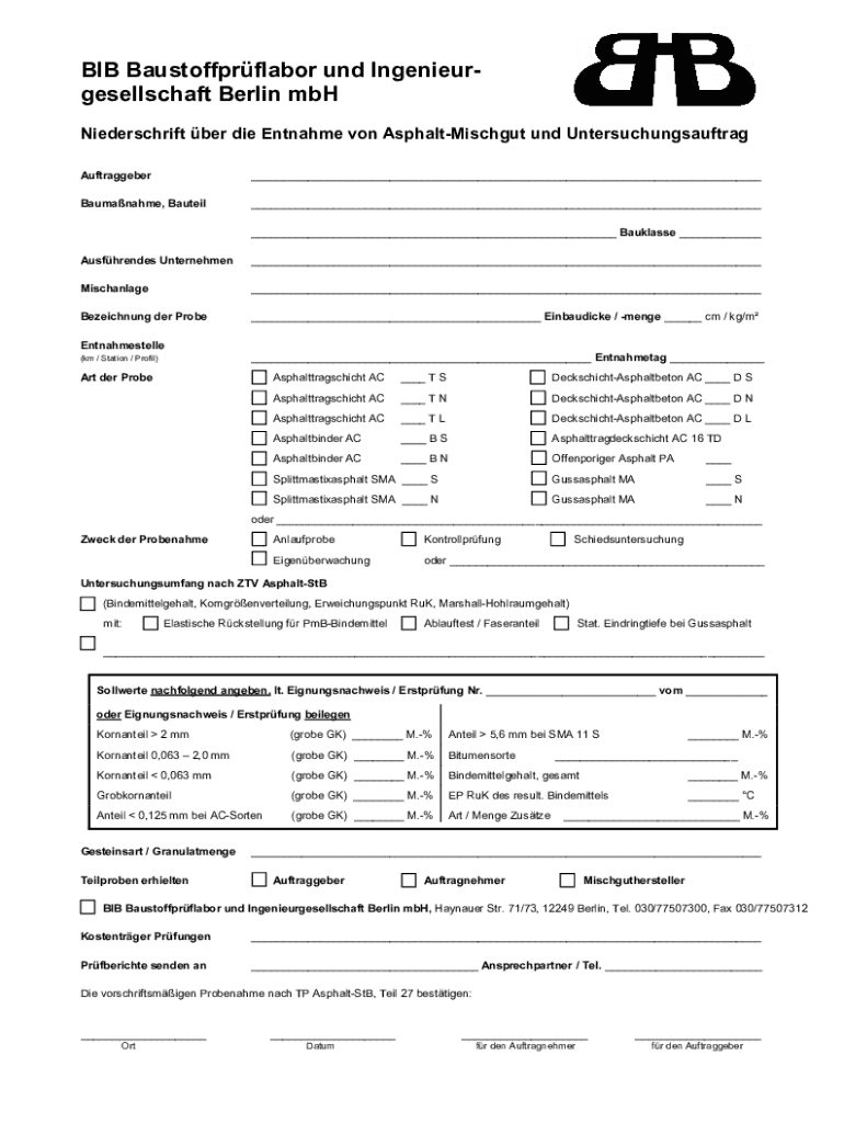 BIB Baustoffprüflabor und Ingenieur kann online auf der Website des Unternehmens ausgefüllt werden. Es stehen auch gedruckte Formulare zur Verfügung.