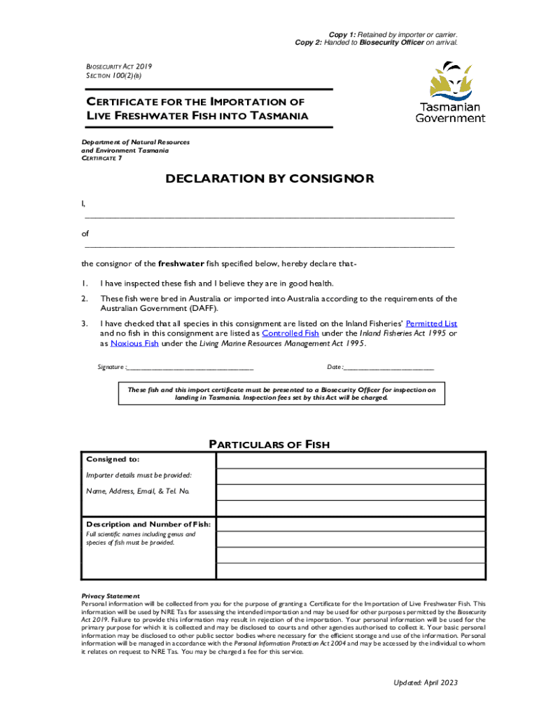 Copy 1: Retained by importer or carrier. Copy 2: Handed to Biosecurity Officer on arrival. BIOSECURITY ACT 2019, SECTION 100(2)(B)CERTIFICATE FOR THE IMPORTATION OF LIVE FRESHWATER FISH INTO TASMANIA