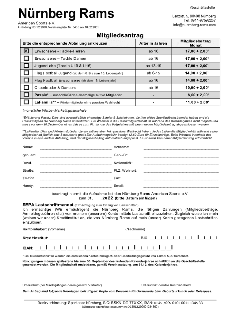 Das Formular für nrnberg rams american sports muss vollständig ausgefüllt und unterschrieben werden.