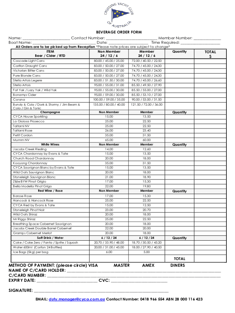 BEVERAGE ORDER FORM Name: ___ Contact Number: ___ Member Number: ___ Boat Name: ___ Date: ___ Time Required: ___ All Orders are to be picked up from Reception *Please note prices are subject to change*