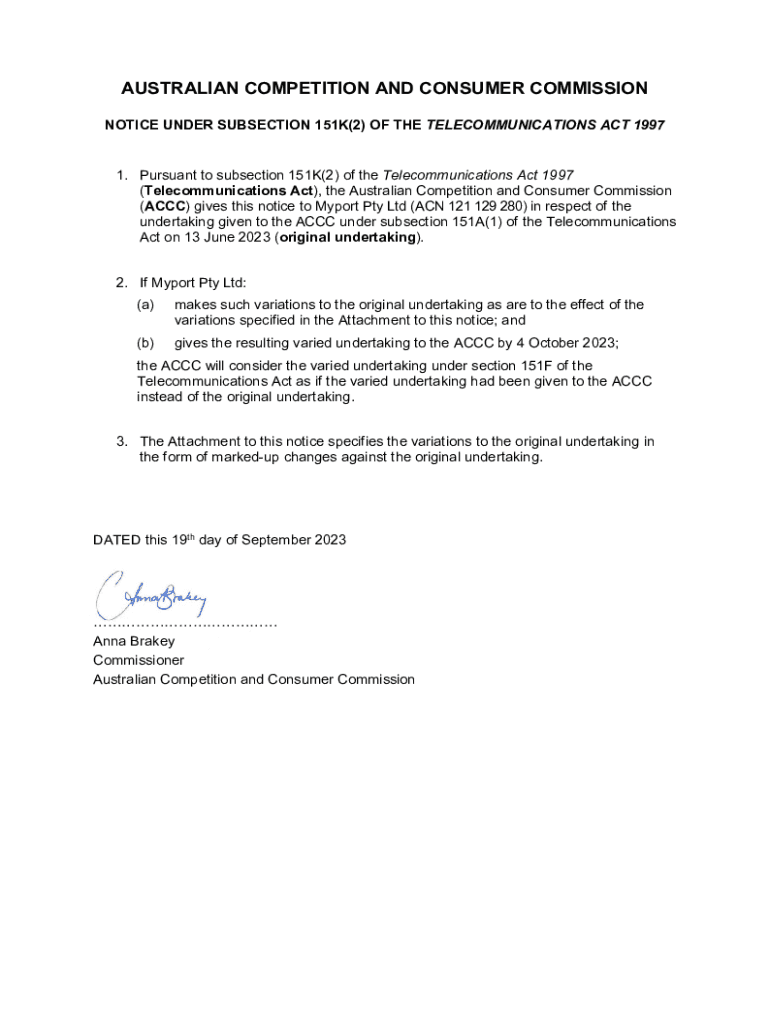 AUSTRALIAN COMPETITION AND CONSUMER COMMISSION NOTICE UNDER SUBSECTION 151K(2) OF THE TELECOMMUNICATIONS ACT 1997 1. Pursuant to subsection 151K(2) of the Telecommunications Act 1997 (Telecommunications
