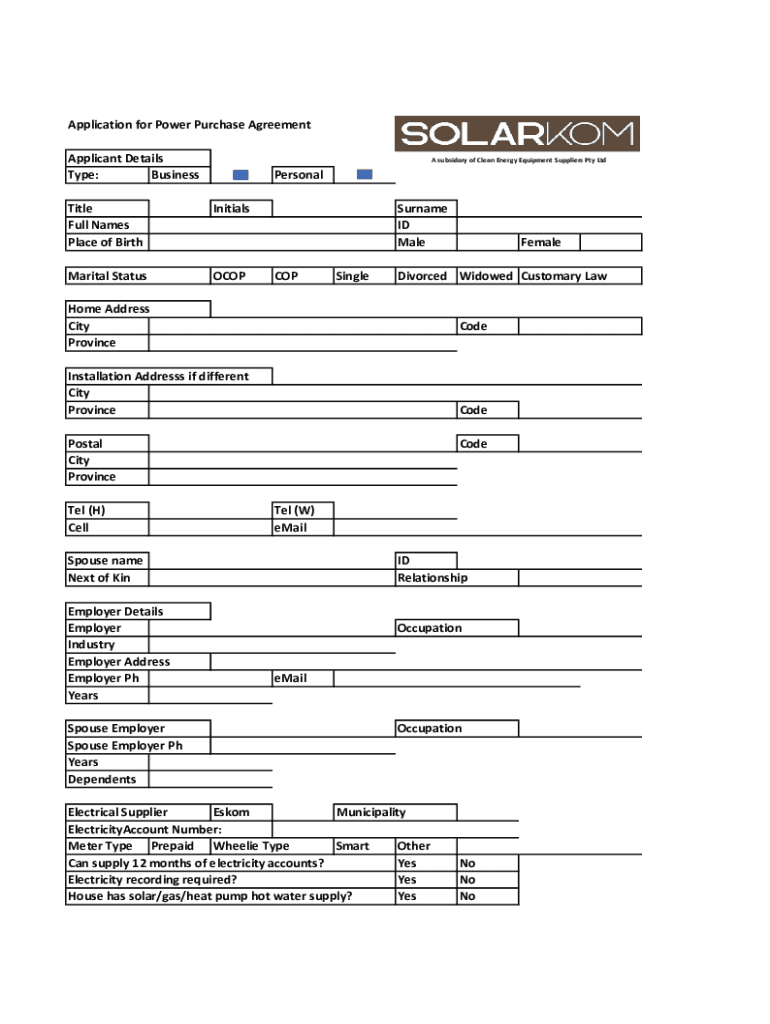 Application for Power Purchase Agreement Applicant Details Type: Business subsidiary of Clean Energy Equipment Suppliers Pty LtdPersonalTitle Full Names Place of BirthInitialsMarital StatusOCOPSurname