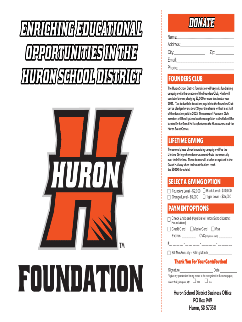 ENRICHING EDUCATIONAL OPPORTUNITIES IN THE HURON SCHOOL DISTRICTDONATE Name: Address: City:Email: Phone:Zip:FOUNDERS CLUB The Huron School District Foundation will begin its fundraising campaign with