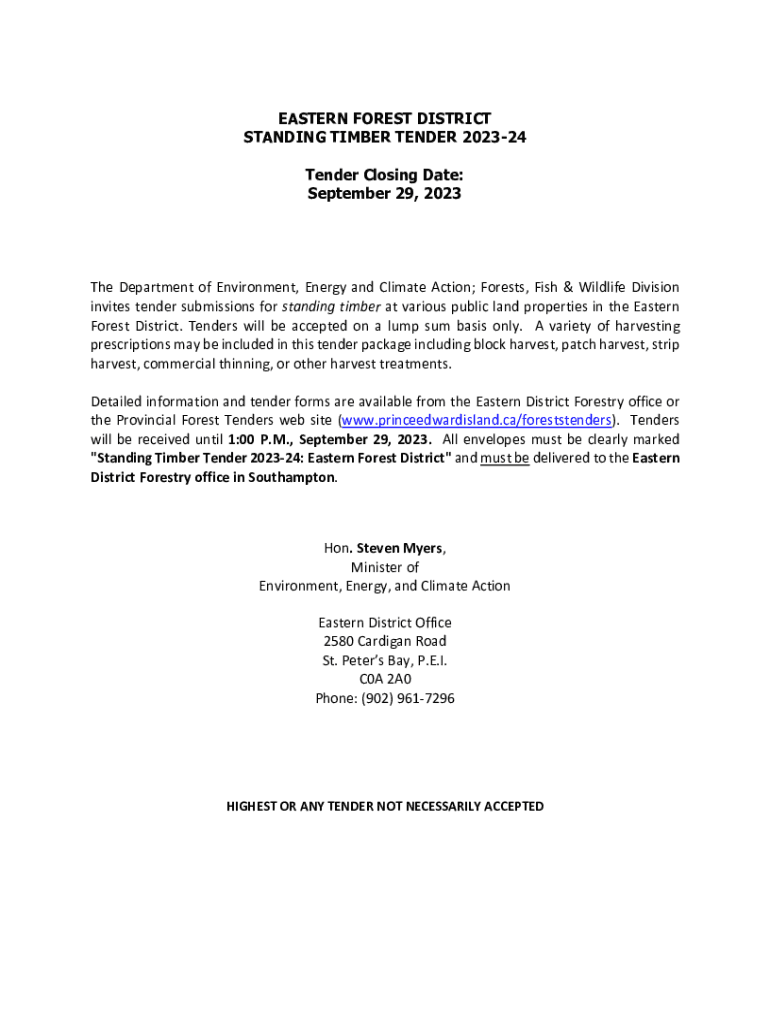 EASTERN FOREST DISTRICT STANDING TIMBER TENDER 202324 Tender Closing Date: September 29, 2023The Department of Environment, Energy and Climate Action; Forests, Fish & Wildlife Division invites tender