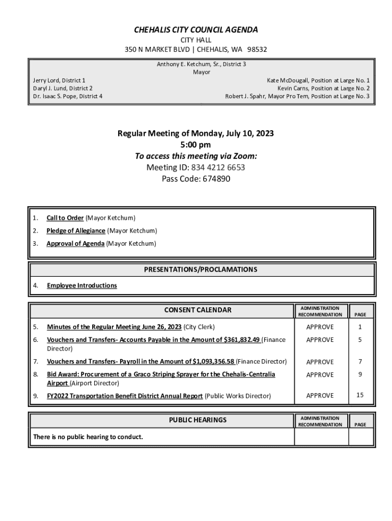 CHEVALIER CITY COUNCIL MENDACITY HALL 350 N MARKET BLVD | CHEVALIER, WA 98532 Anthony E. Ketchup, Sr., District 3 Mayor Jerry Lord, District 1 Daryl J. Land, District 2 Dr. Isaac S. Pope, District