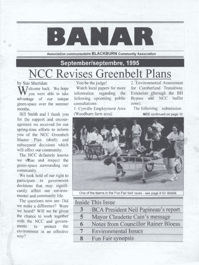 ANA R Association communautaireBLACKBURN Community Association September/September, 1995NCC Revises Greenbelt Plans by Sue Sheridan welcome back. We hope you were able to take advantage of our unique