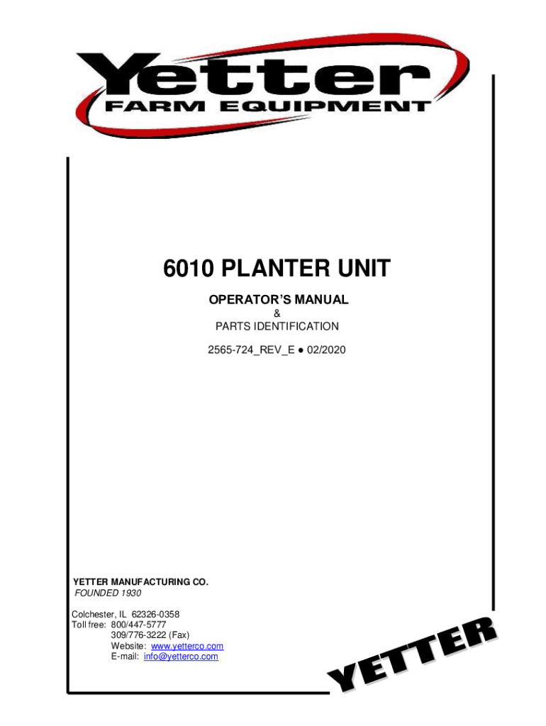 6010 PLANTER UNIT OPERATORS MANUAL & PARTS IDENTIFICATION 2565724_REV_E 02/2020YETTER MANUFACTURING CO. FOUNDED 1930 Colchester, IL 623260358 Toll free: 800/4475777 309/7763222 (Fax) Website: www.yetterco.com