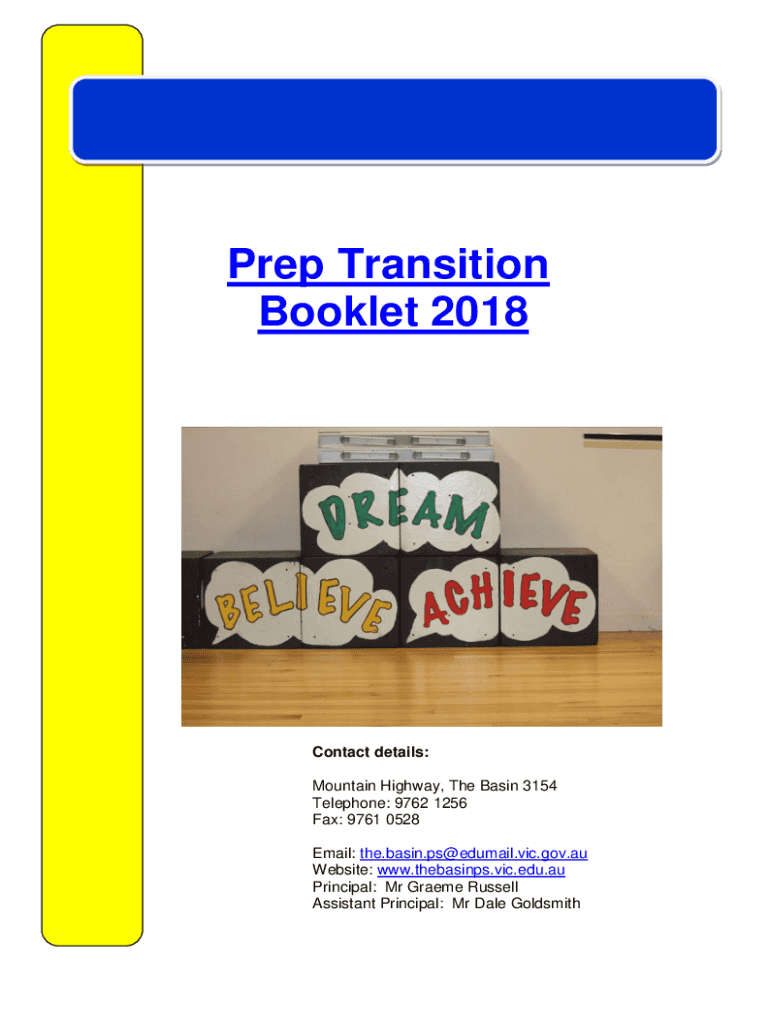Prep Transition Booklet 2018Contact details: Mountain Highway, The Basin 3154 Telephone: 9762 1256 Fax: 9761 0528 Email: the.basin.ps@edumail.vic.gov.au Website: www.thebasinps.vic.edu.au Principal: