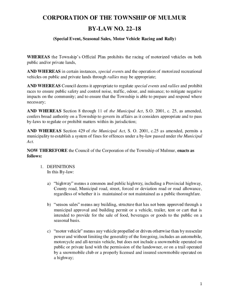 CORPORATION OF THE TOWNSHIP OF MURMUR BYLAW NO. 2218 (Special Event, Seasonal Sales, Motor Vehicle Racing and Rally)WHEREAS the Townships Official Plan prohibits the racing of motorized vehicles on