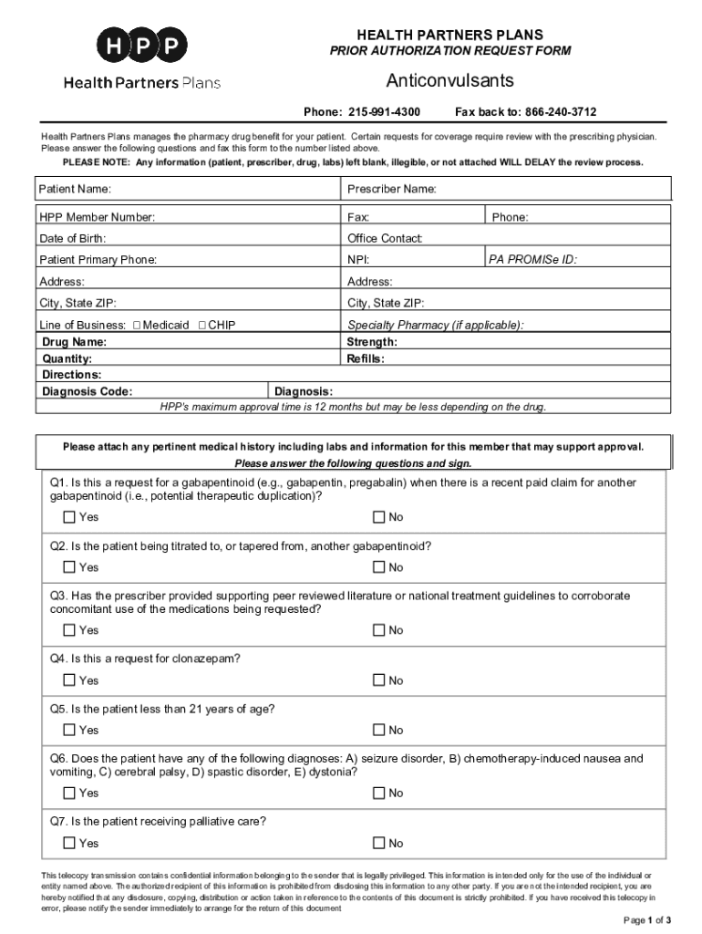 HEALTH PARTNERS PLANS PRIOR AUTHORIZATION REQUEST FORMAnticonvulsants Phone: 2159914300Fax back to: 8662403712Health Partners Plans manages the pharmacy drug benefit for your patient. Certain requests