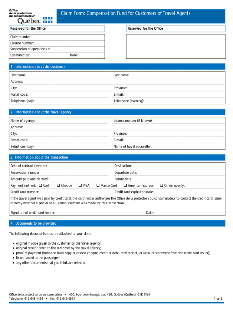 Claim Form: Compensation Fund for Customers of Travel Agents Reserved for the OfficeReserved for the OfficeClaim number: License number: Suspension of operations of: Examined by:Date:1. Information