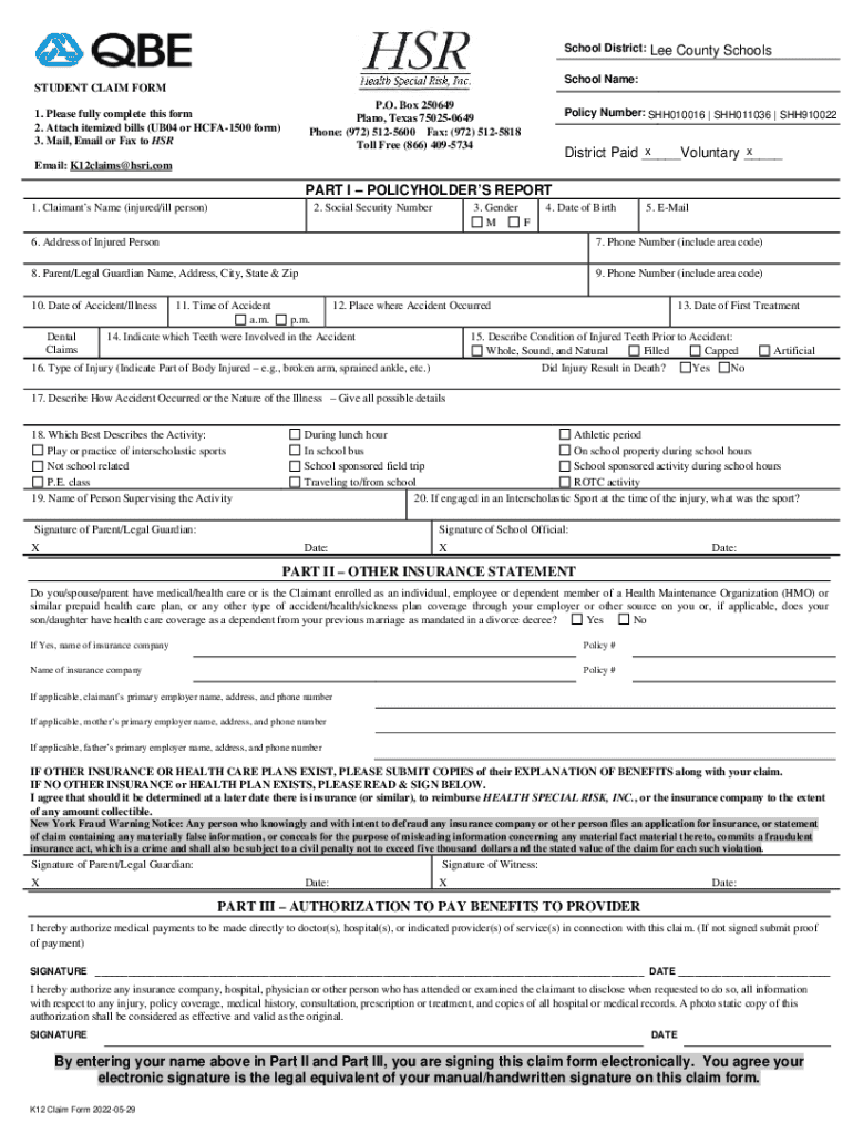 School District:Lee County SchoolsSchool Name:STUDENT CLAIM FORM P.O. Box 250649 Plano, Texas 750250649 Phone: (972) 5125600 Fax: (972) 5125818 Toll Free (866) 40957341. Please fully complete this