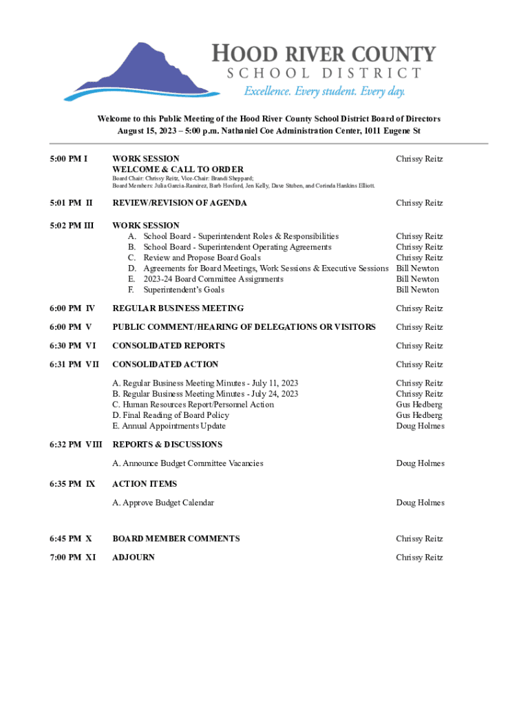 Welcome to this Public Meeting of the Hood River County School District Board of Directors