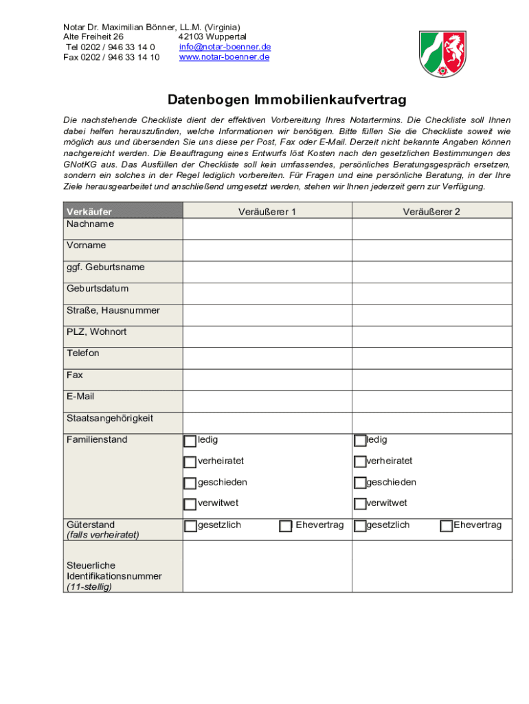 Fax 0202 / 946 33 14 10Datenbogen Immobilienkaufvertrag