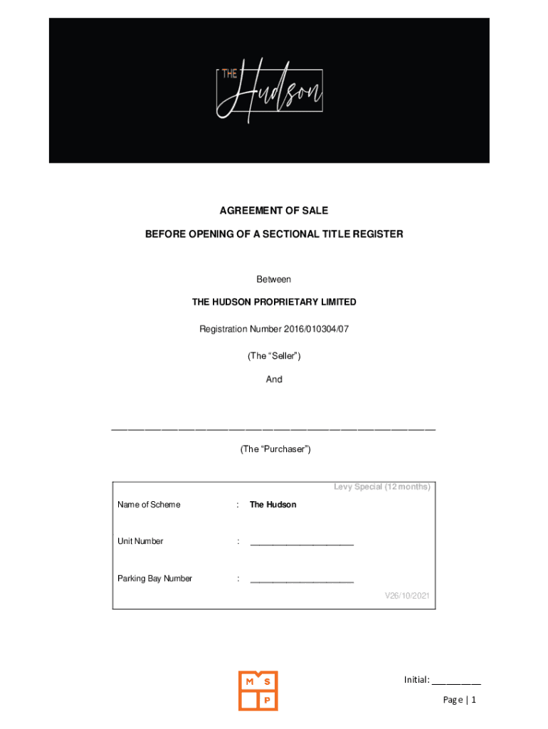 AGREEMENT OF SALE BEFORE OPENING OF A SECTIONAL TITLE REGISTERBetween THE HUDSON PROPRIETARY LIMITED Registration Number 2016/010304/07 (The Seller) And___ (The Purchaser)Levy Special (12 months)