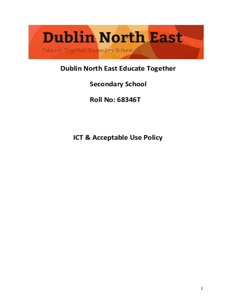 Dublin North East Educate Together Secondary School Roll No: 68346TICT & Acceptable Use Policy1Introduction This policy is informed by the vision for Dublin North East ESS coupled with the school\'s