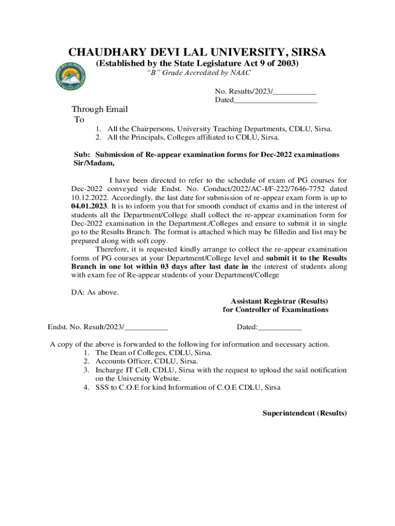 CHAUDHARY DEVI LAW UNIVERSITY, SIRS (Established by the State Legislature Act 9 of 2003) B Grade Accredited by NAACP No. Results/2023/___ Dated___Through Email To 1. All the Chairpersons, University