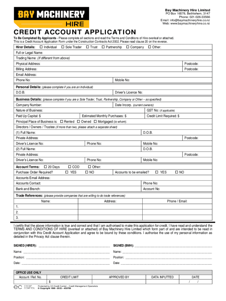 Bay Machinery Hire Limited PO Box 16578, Bethlehem, 3147 Phones: 02102633566 Email: info@baymachineryhire.co.nz Web: www.baymachineryhire.co.nzCREDIT ACCOUNT Application Be Completed By Applicants