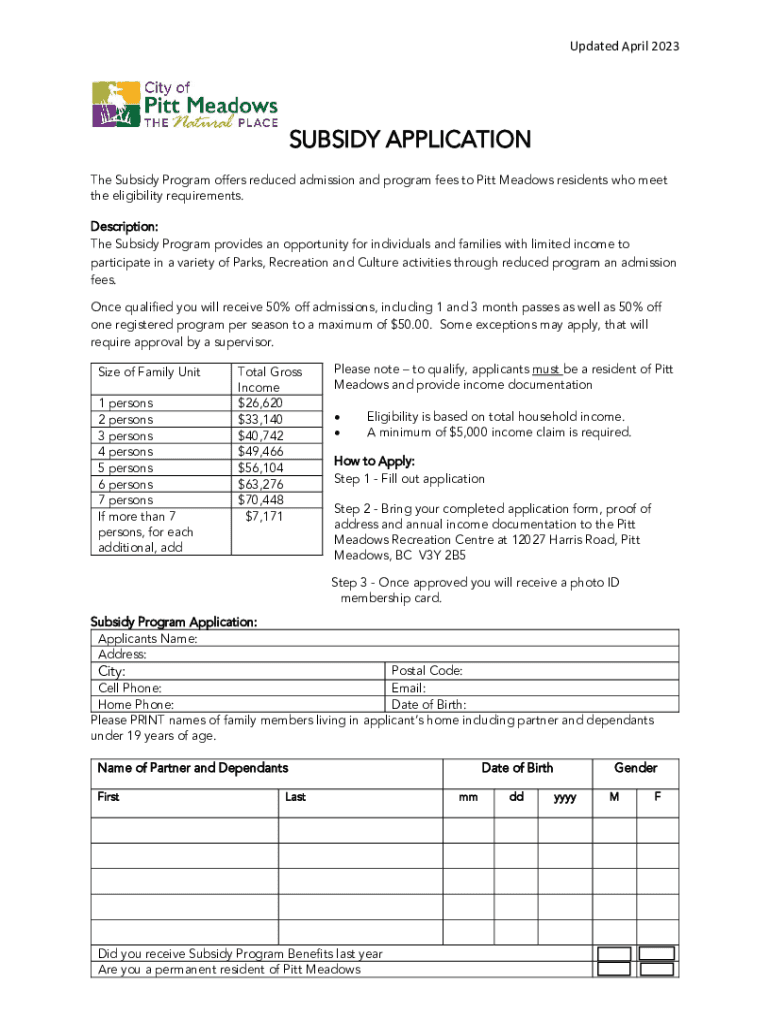 Updated April 2023SUBSIDY APPLICATION The Subsidy Program offers reduced admission and program fees to Pitt Meadows residents who meet the eligibility requirements. Description: The Subsidy Program