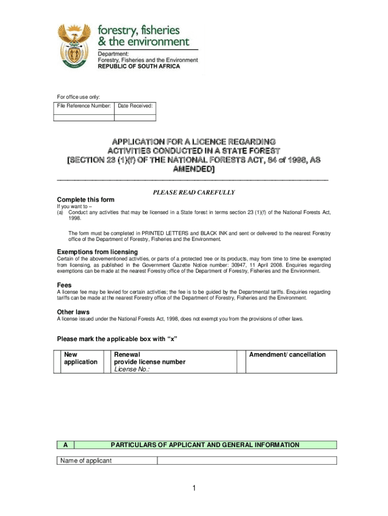 For office use only: File Reference Number:Date Received:APPLICATION FOR A License REGARDING ACTIVITIES CONDUCTED IN A STATE FOREST [SECTION 23 (1)(f) OF THE NATIONAL FORESTS ACT, 84 of 1998, AS AMENDED]