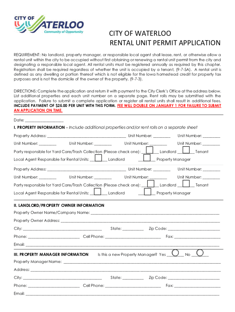 CITY OF WATERLOO RENTAL UNIT PERMIT APPLICATION REQUIREMENT: No landlord, property manager, or responsible local agent shall lease, rent, or otherwise allow a rental unit within the city to be occupied