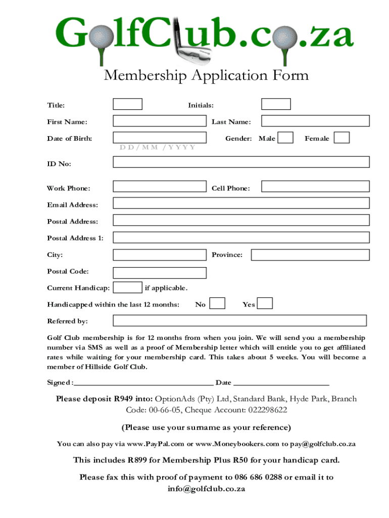 Membership Application Form Title:Initials:First Name:Last Name:Date of Birth:Gender: MaleFemaleDD/MM /YYY ID No: Work Phone:Cell Phone:Email Address: Postal Address: Postal Address 1: City:Province:Postal