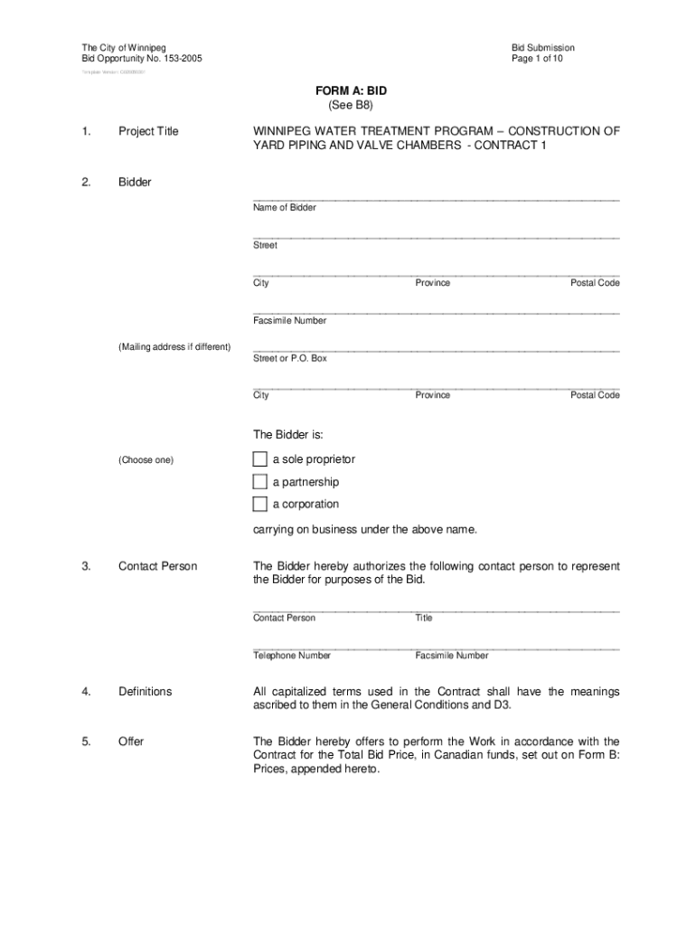 The City of Winnipeg Bid Opportunity No. 1532005Bid Submission Page 1 of 10Template Version: C020050301FORM A: BID (See B8) 1. Project Title2. BidderWINNIPEG WATER TREATMENT PROGRAM CONSTRUCTION OF