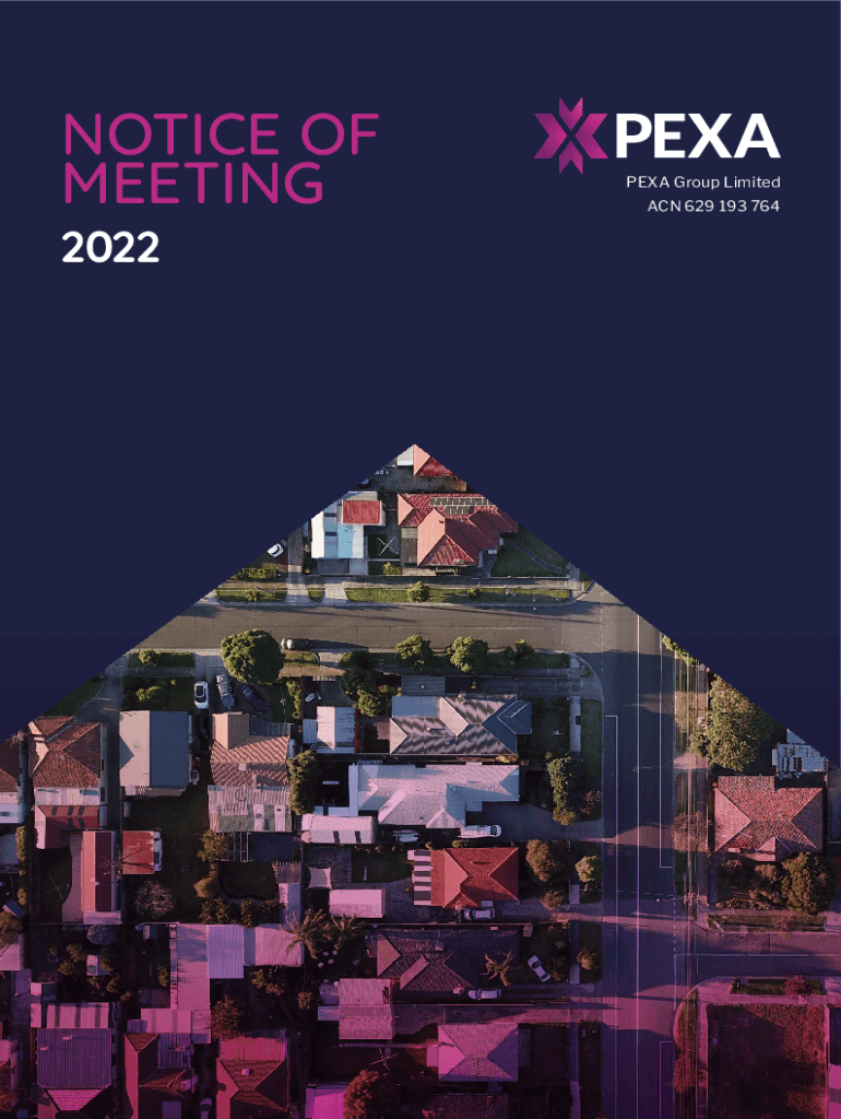NOTICE OF MEETING 2022PEXA Group Limited ACN 629 193 764NOTICE OF ANNUAL GENERAL MEETING PEA Group Limited ABN 23 629 193 764 Notice is given that the Annual General Meeting (AGM or Meeting) of shareholders