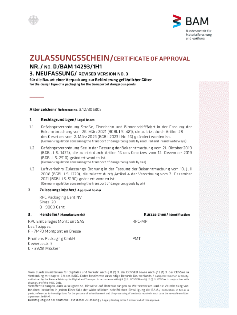 ZULASSUNGSSCHEIN/CERTIFICATE OF APPROVAL
