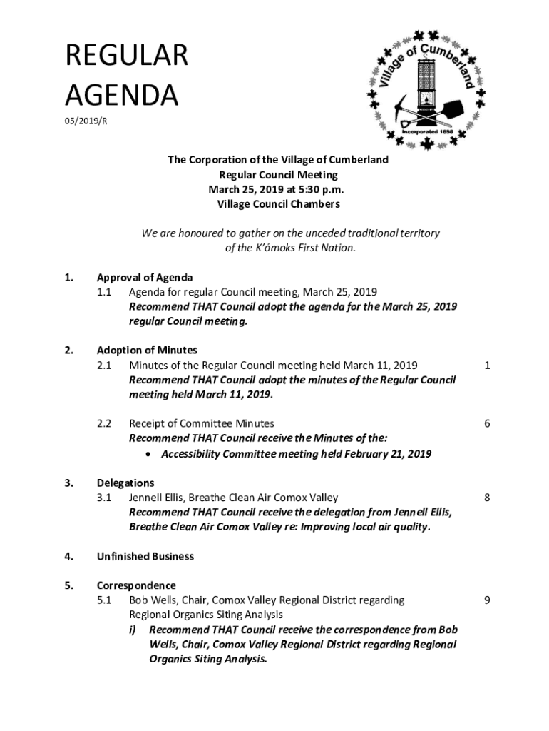 REGULAR AGENDA 05/2019/The Corporation of the Village of Cumberland Regular Council Meeting March 25, 2019, at 5:30 p.m. Village Council Chambers We are honored to gather on the needed traditional