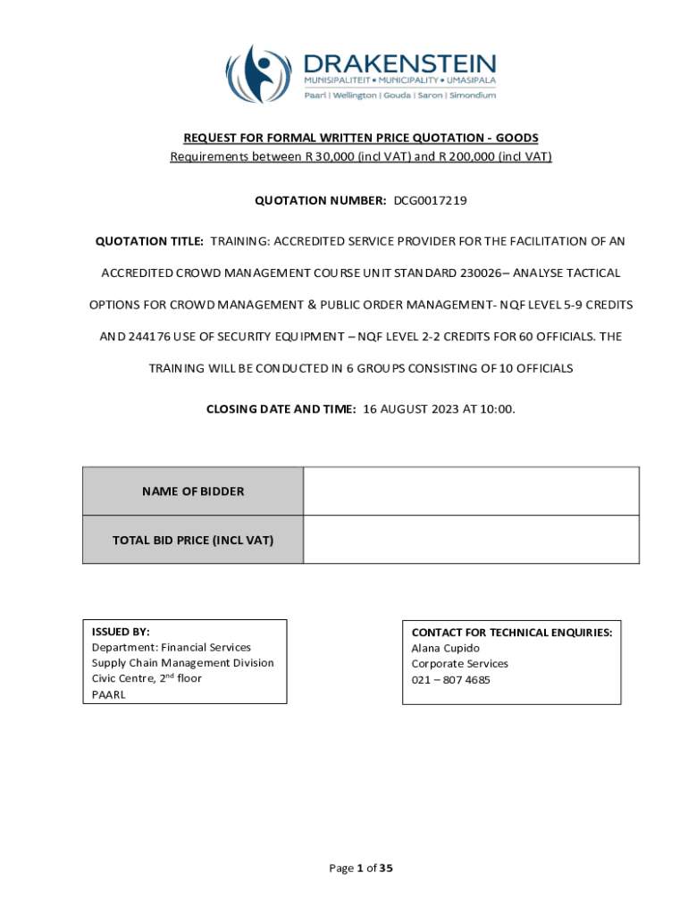 REQUEST FOR FORMAL WRITTEN PRICE QUOTATION GOODS Requirements between R 30,000 (incl VAT) and R 200,000 (incl VAT) QUOTATION NUMBER: DCG0017219 QUOTATION TITLE: TRAINING: ACCREDITED SERVICE PROVIDER