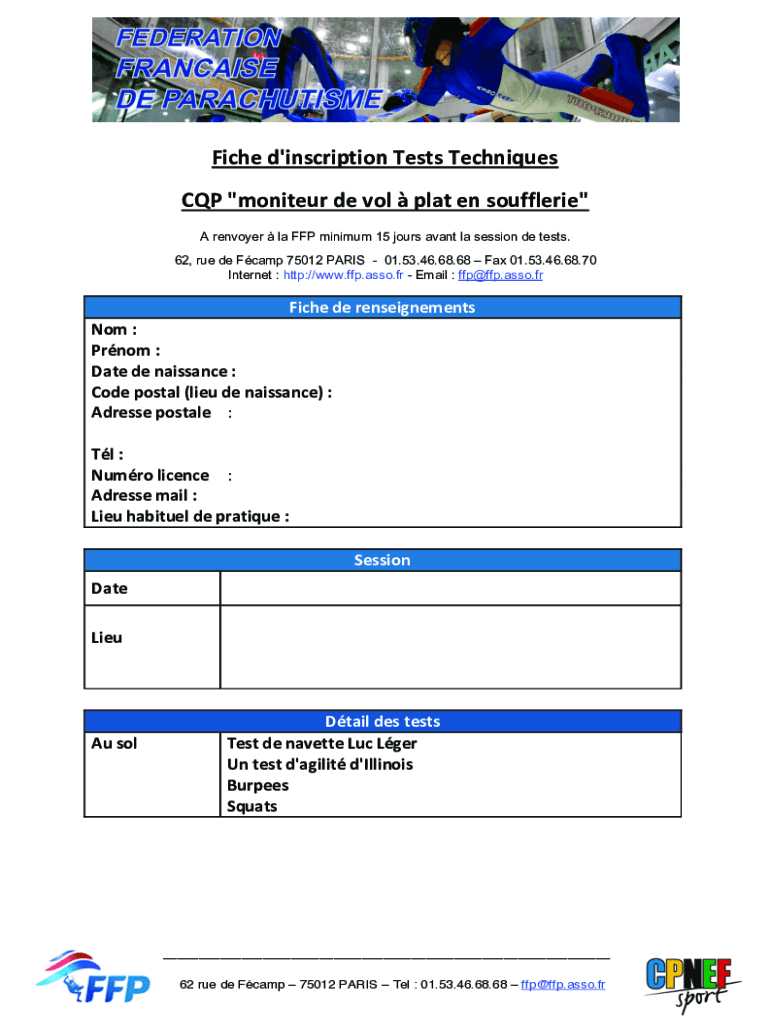 Toute personne souhaitant participer à une session de soufflerie doit déposer la fiche d'inscription.