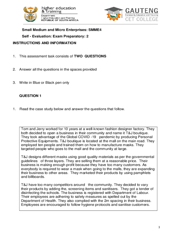 Small Medium and Micro Enterprises: SMME4 Self Evaluation: Exam Preparatory: 2 INSTRUCTIONS AND INFORMATION1. This assessment task consists of TWO QUESTIONS2. Answer all the questions in the spaces