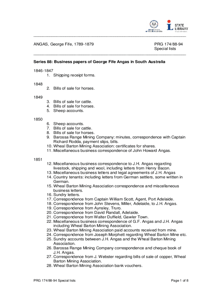 ___ ANGUS, George Fife, 17891879PRG 174/8894 Special lists ___ Series 88: Business papers of George Fife Angus in South Australia 18461847 1. Shipping receipt forms. 1848 2. Bills of sale for horses.