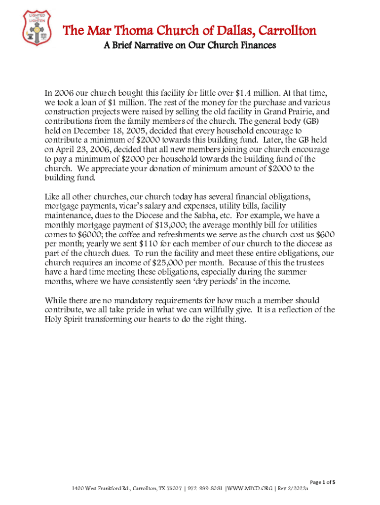 The Mar Thomas Church of Dallas, Carrollton A Brief Narrative on Our Church Finances In 2006 our church bought this facility for little over $1.4 million. At that time, we took a loan of $1 million.