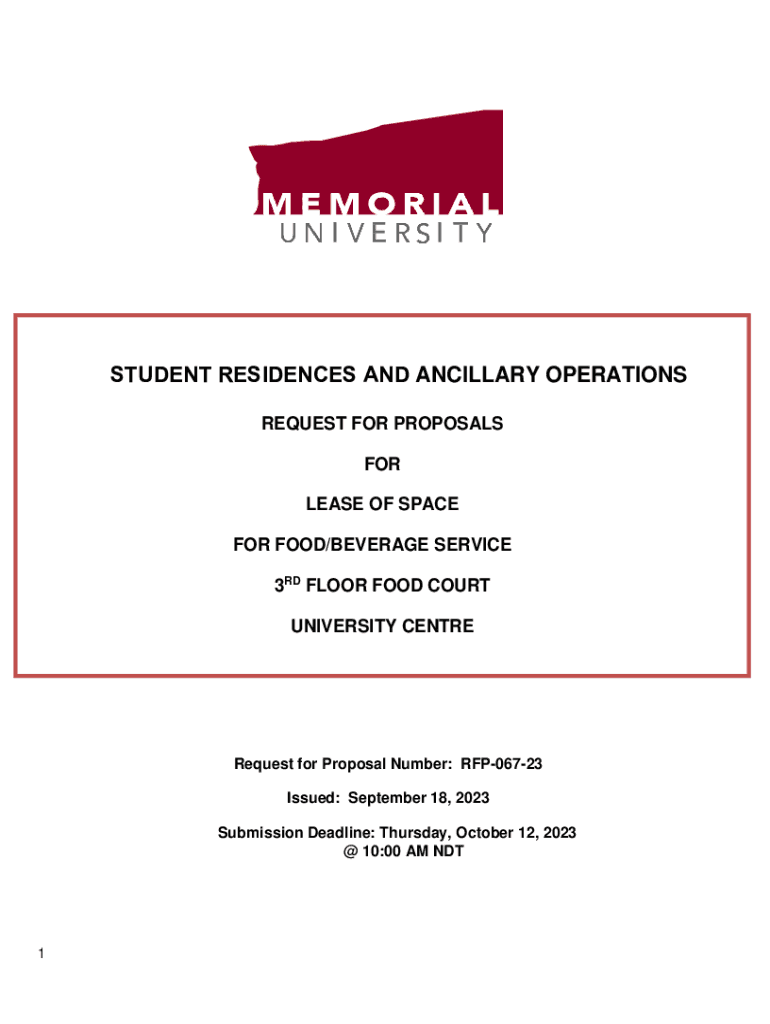 STUDENT RESIDENCES AND ANCILLARY OPERATIONS REQUEST FOR PROPOSALS FOR LEASE OF SPACE FOR FOOD/BEVERAGE SERVICE 3RD FLOOR FOOD COURT UNIVERSITY CENTRERequest for Proposal Number: RFP06723 Issued: September