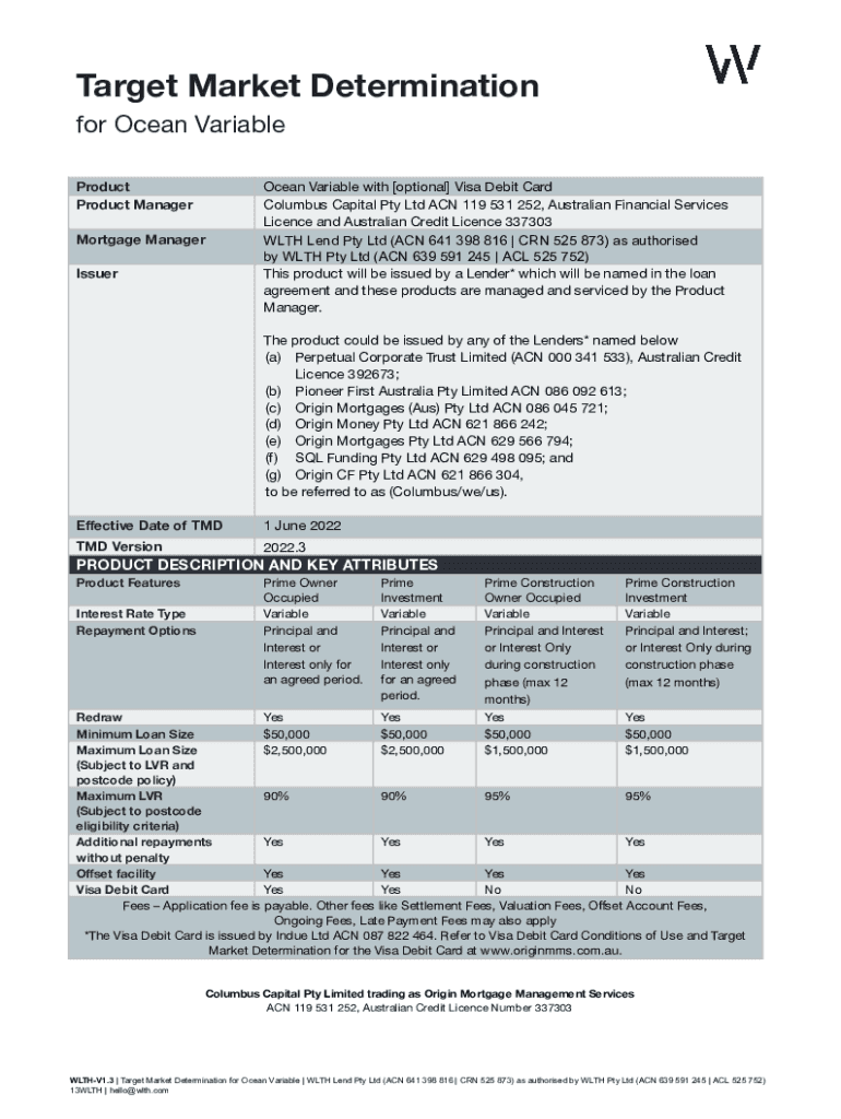 Target Market Determination for Ocean Variable Product Manager Mortgage Manager IssuerOcean Variable with [optional] Visa Debit Card Columbus Capital Pty Ltd ACN 119 531 252, Australian Financial