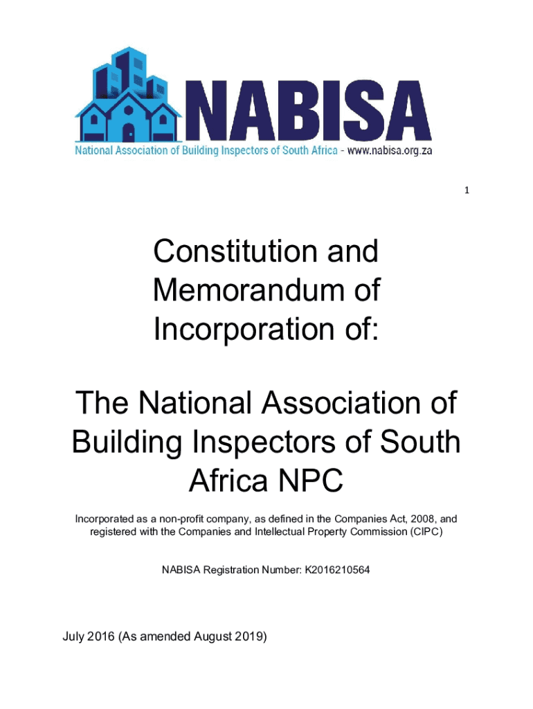 1Constitution and Memorandum of Incorporation of: The National Association of Building Inspectors of South Africa NPC Incorporated as a nonprofit company, as defined in the Companies Act, 2008, and