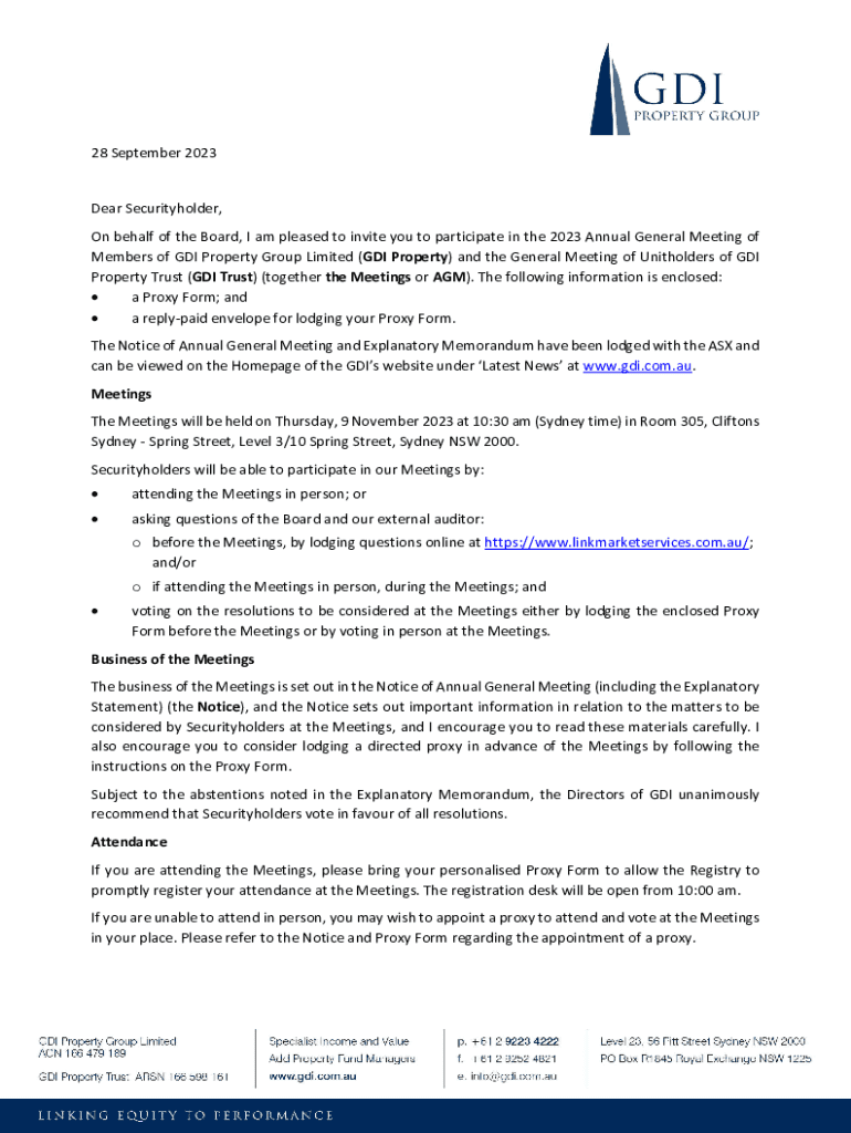 28 September 2023Dear Security holder, On behalf of the Board, I am pleased to invite you to participate in the 2023 Annual General Meeting of Members of GDI Property Group Limited (GDI Property)