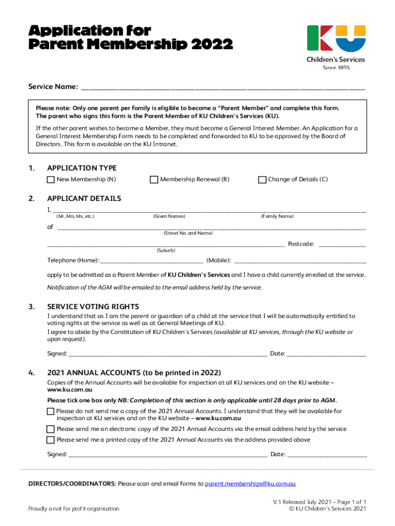 Application for Parent Membership 2022 Service Name: ___ Please note: Only one parent per family is eligible to become a Parent Member and complete this form. The parent who signs this form is the