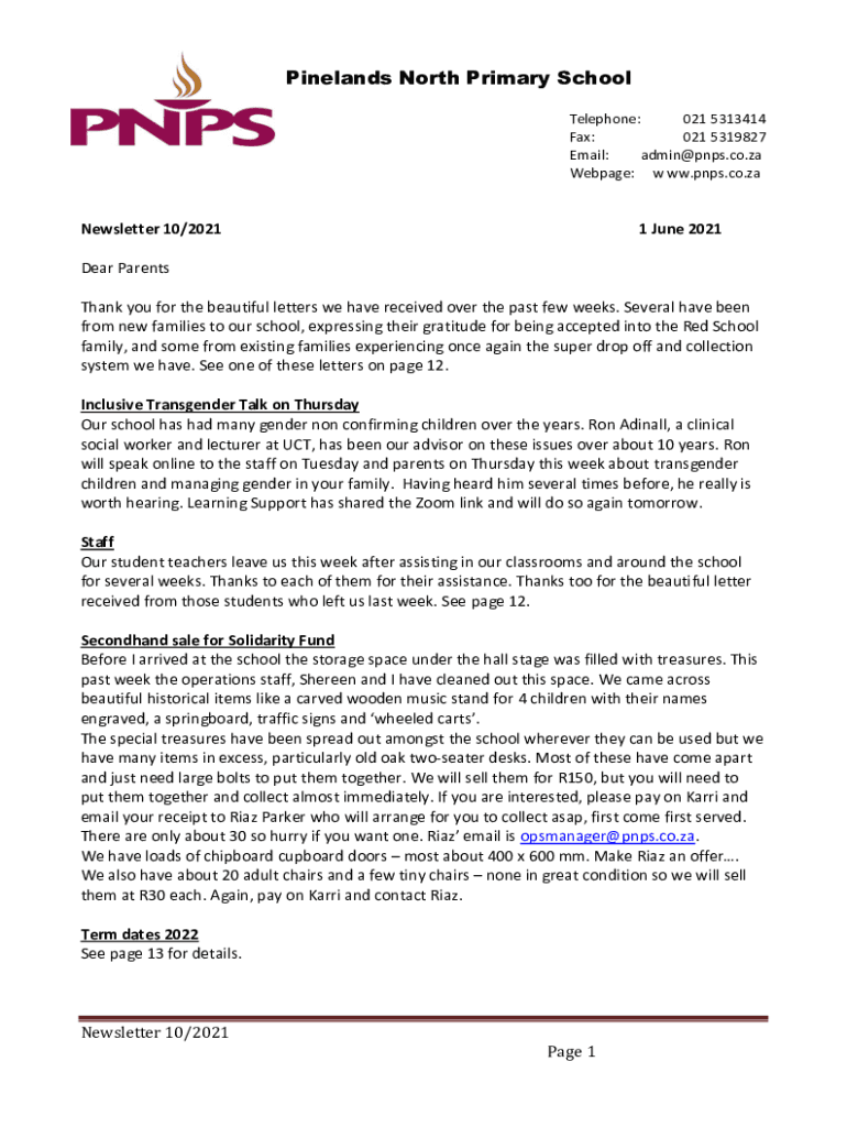 Pin elands North Primary School Telephone: 021 5313414 Fax: 021 5319827 Email: admin@pnps.co.za Webpage: w WW.NPS.co.newsletter 10/20211 June 2021Dear Parents Thank you for the beautiful letters we