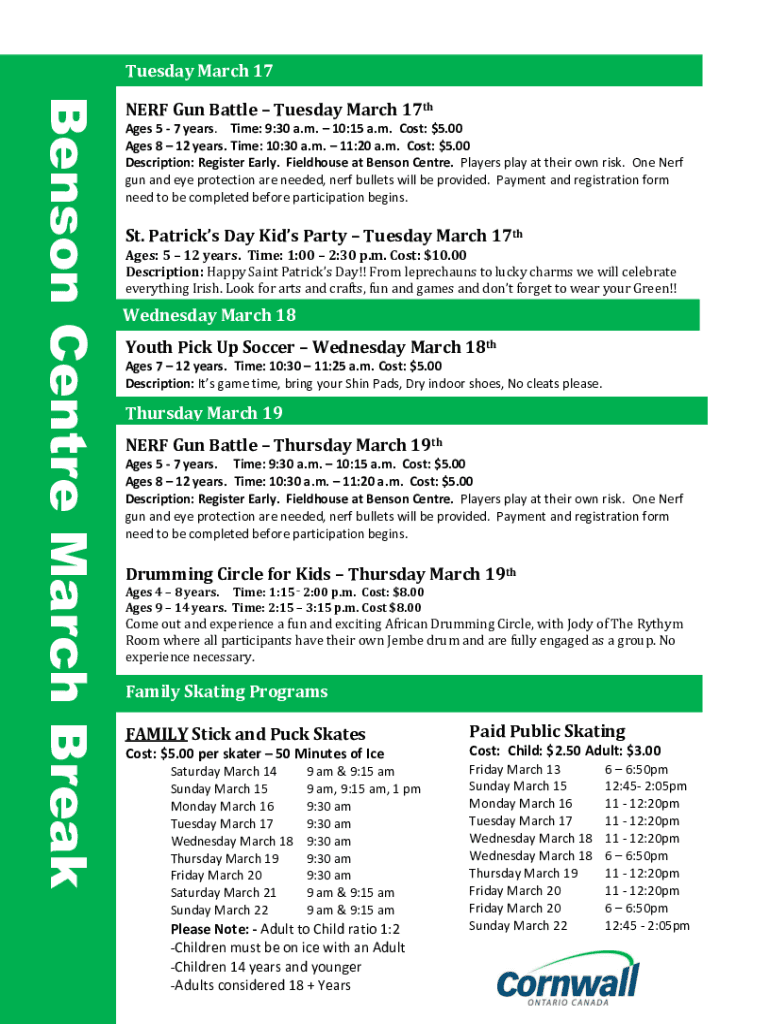 Tuesday March 17Benson Center March Breaker Gun Battle Tuesday, March 17th Ages 5 7 years. Time: 9:30 a.m. 10:15 a.m. Cost: $5.00 Ages 8 12 years. Time: 10:30 a.m. 11:20 a.m. Cost: $5.00 Description: