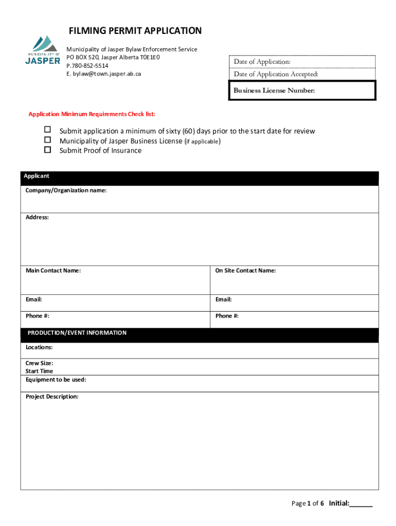 FILMING PERMIT APPLICATION Municipality of Jasper Bylaw Enforcement Service PO BOX 520, Jasper Alberta T0E1E0 P.7808525514 E. bylaw@town.jasper.ab.caDate of Application: Date of Application Accepted: