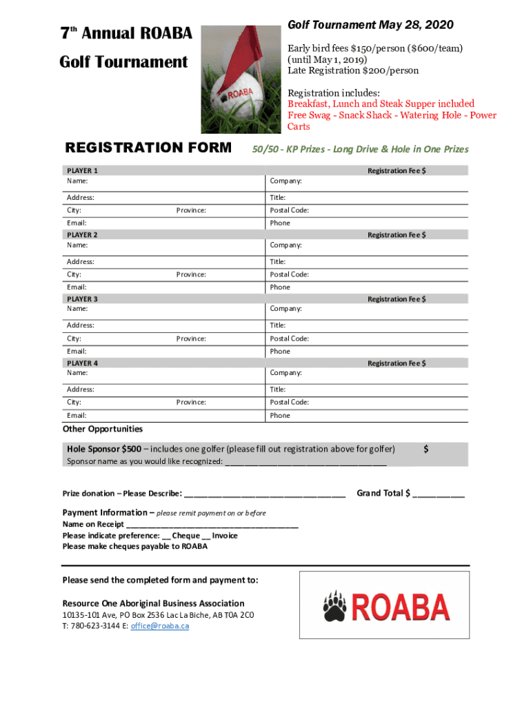 Golf Tournament May 28, 20207th Annual ROABAEarly bird fees $150/person ($600/team)