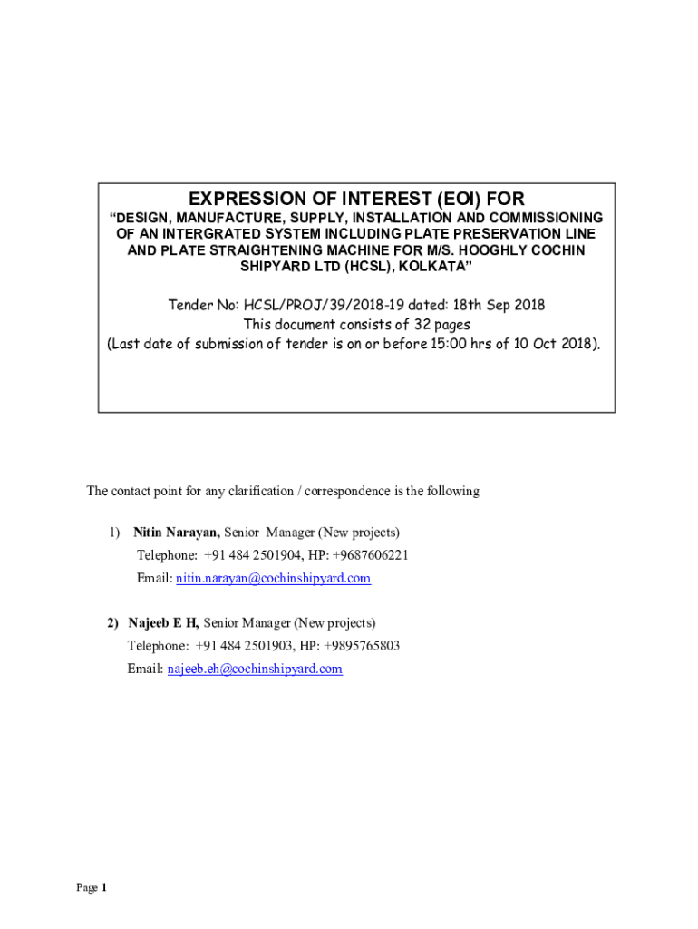 EXPRESSION OF INTEREST (EOI) FOR DESIGN, MANUFACTURE, SUPPLY, INSTALLATION AND COMMISSIONING OF AN INTEGRATED SYSTEM INCLUDING PLATE PRESERVATION LINE AND PLATE STRAIGHTENING MACHINE FOR M/S. HIGHLY