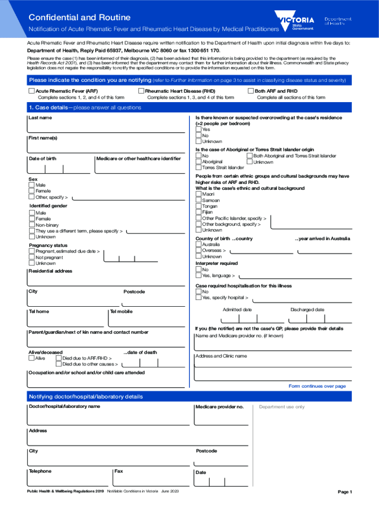 Confidential and Routine Notification of Acute Thematic Fever and Rheumatic Heart Disease by Medical Practitioners Acute Thematic Fever and Rheumatic Heart Disease require written notification to