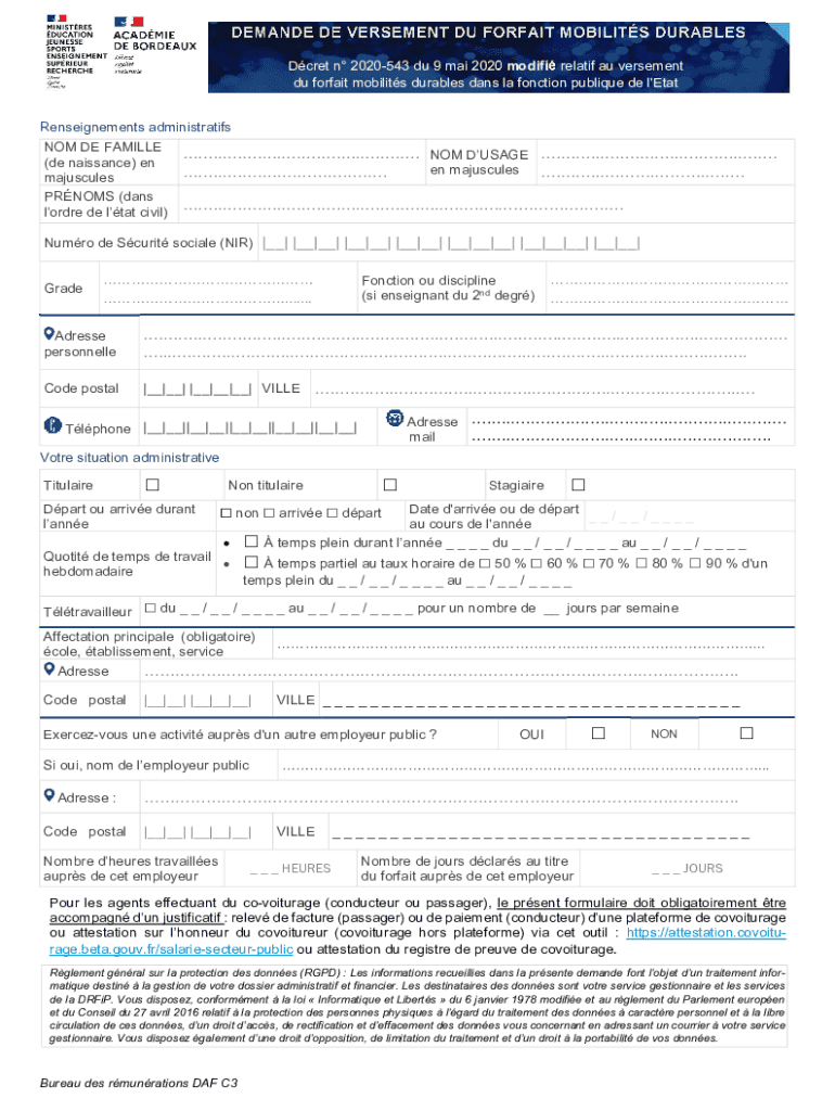 DEMAND DE VEHEMENT DU FORFEIT MOBILITY DURABLES Crew n 2020543 Du 9 Mai 2020 modify related AU vehement Du forfeit mobility durables days la function oblique de l\'EtatRenseignements administration