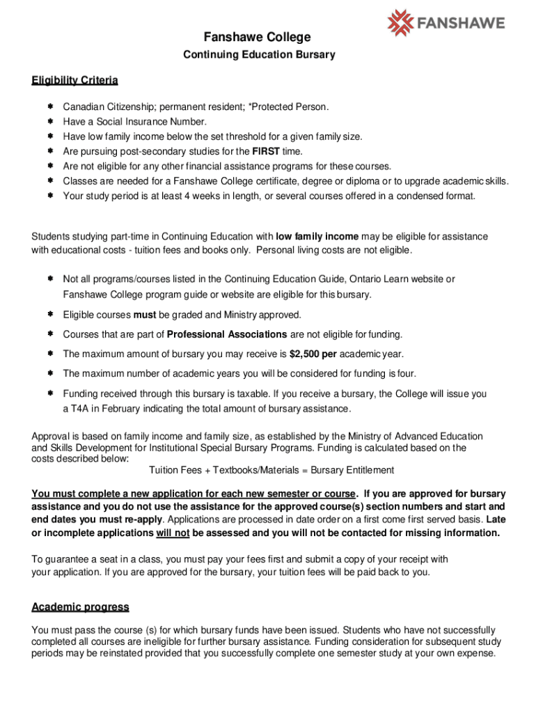 Fanfare College Continuing Education Bursary Eligibility Criteria Canadian Citizenship; permanent resident; *Protected Person. Have a Social Insurance Number. Have low family income below the set